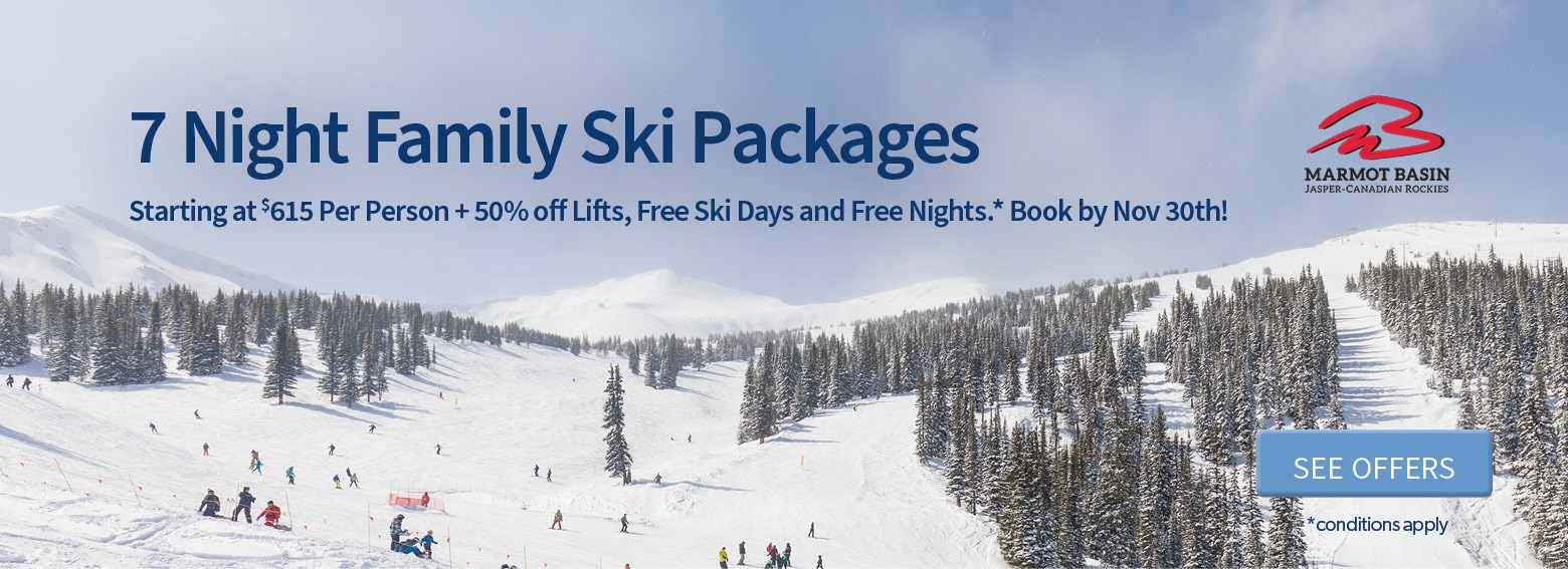 PROMO: Stay 6 nights and receive 7th day for free at Chateau Jasper when you vacation with Merit. Receive 50% off as well as an extra day lift for FREE on 5 days of lift passes or more at Jasper’s Marmot Basin.